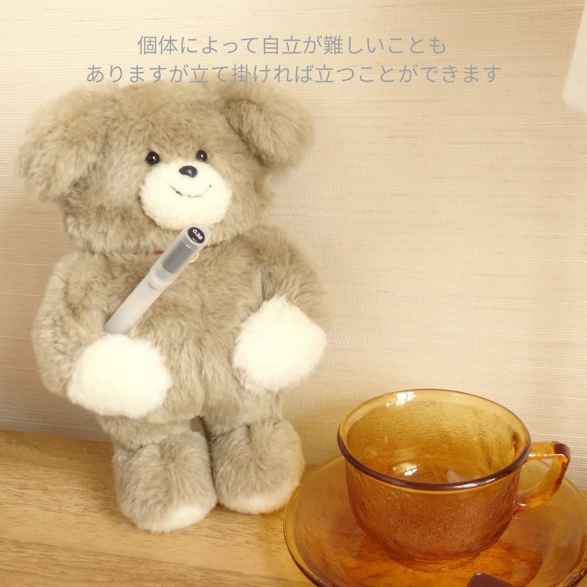 ・腕はおなかに縫い付けてあるので、隙間にペンなどを通して持たせることもできます